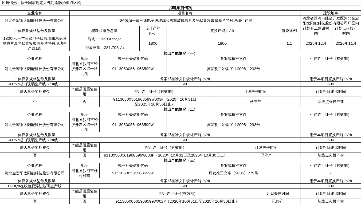 河北金宏陽太陽能科技股份有限公司1800t/d一窯三線電子級玻璃和汽車玻璃原片及光伏背板玻璃基片特種玻璃生產(chǎn)線項(xiàng)目產(chǎn)能置換方案
