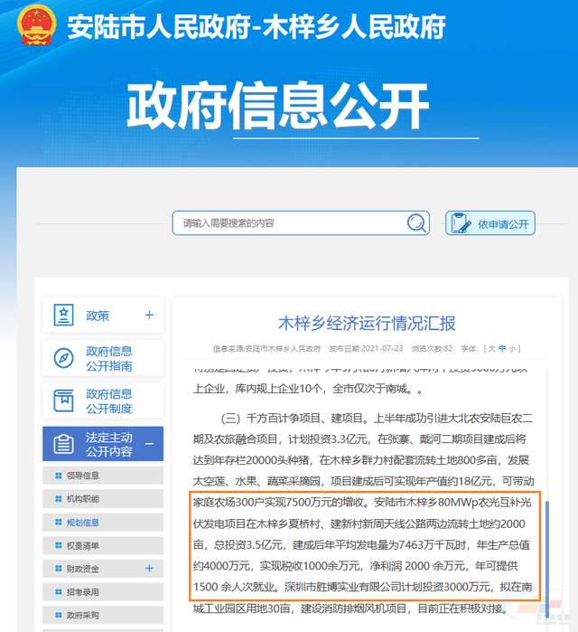 在2021年7月,木梓鄉(xiāng)人民政府一篇《木梓鄉(xiāng)經(jīng)濟運行情況匯報》文章中曾提及,安陸市木梓鄉(xiāng)80MWp農(nóng)光互補光伏發(fā)電項目建成后年平均發(fā)電量為7463萬千瓦時,年生產(chǎn)總值約4000萬元,實現(xiàn)稅收1000余萬元,凈利潤 2000 余萬元,年可提供 1500 余人次就業(yè)。